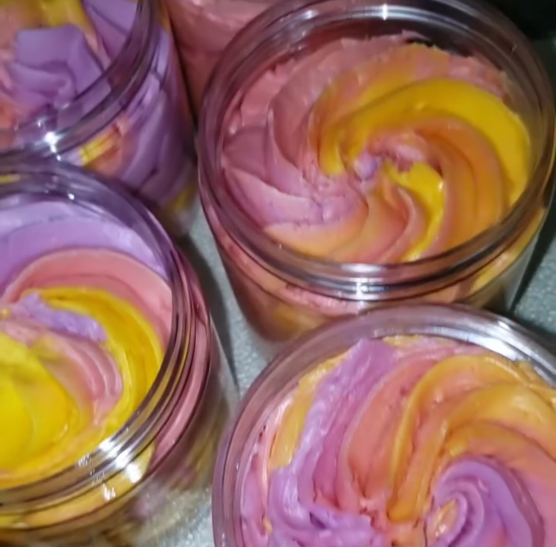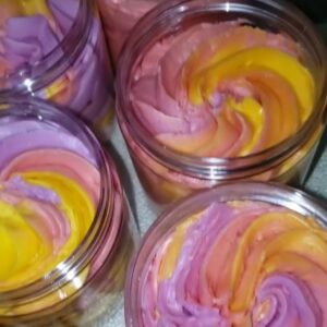 Scented Body Butter made with all natural oils and butters with a delightful homemade dessert cake scent and fruits.